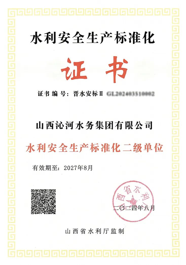 近日,省水利廳向沁河水務集團頒發(fā)了“水利安全生產(chǎn)標準化二級單位”合格證書和牌匾。
