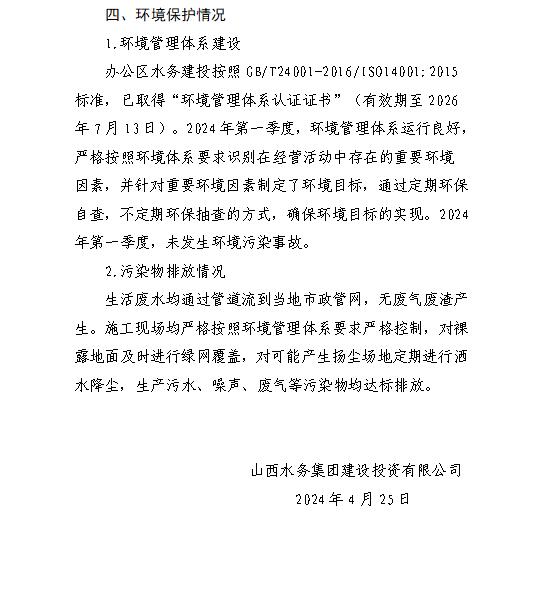 山西水投汾景水務(wù)有限公司2024年第一季度信息公開...