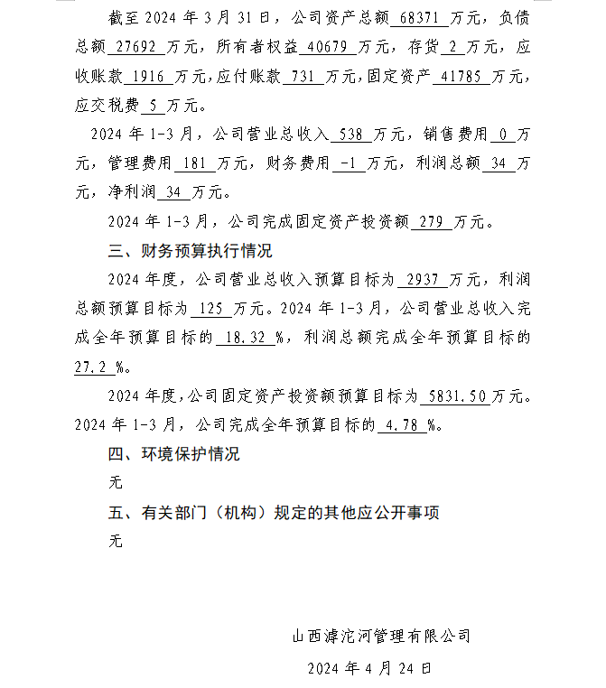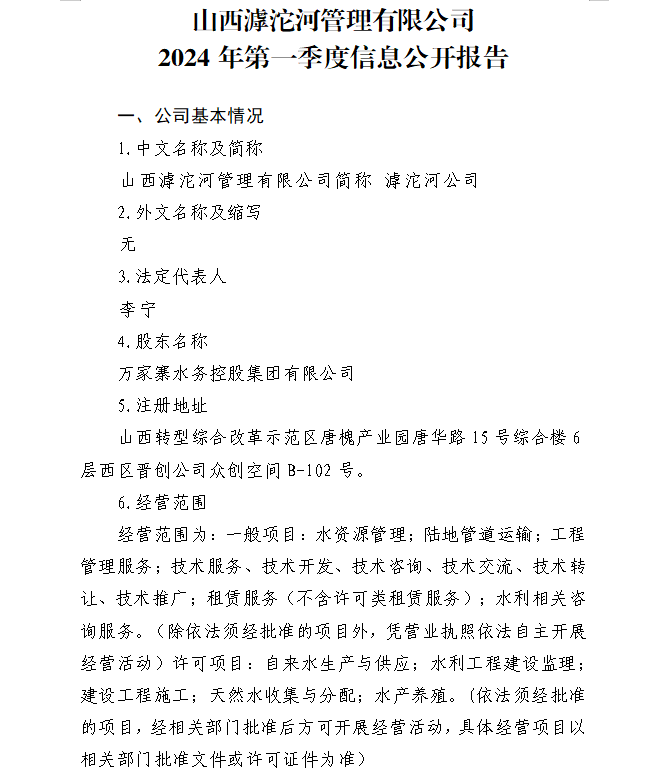 山西沁河水務集團有限公司2024年第一季度信息公開...