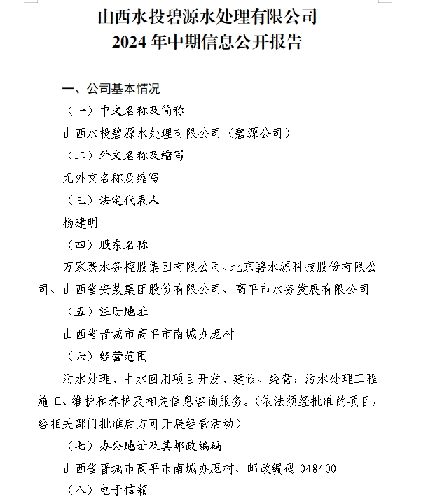 山西水投碧源水處理有限公司2024年第三季度信息公...
