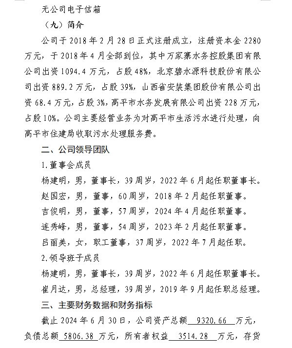 山西水投碧源水處理有限公司2023年度財務(wù)等重大信...