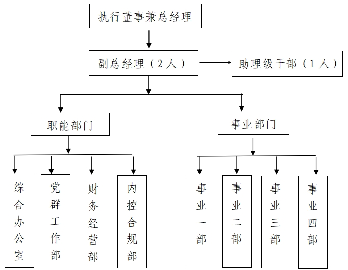 根據(jù)集團批復的“六定”方案,公司批復企業(yè)負責人3人(已配備1正2副),助理級干部1人(已配備總工程師),中層管理人員8正8副(已配備8正8副),內(nèi)設職能部門4個,事業(yè)部門4個。