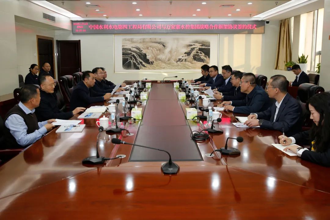 11月14日,萬家寨水控集團黨委書記、董事長、總經理蘭康杰與中國水利水電第四工程局有限公司(以下簡稱:中國水電四局)黨委書記、董事長、總經理龐旭舉行工作會談并簽署戰(zhàn)略合作框架協(xié)議。雙方將本著優(yōu)勢互補、互惠互利、合作共贏的原則,構建起長期戰(zhàn)略合作關系。集團公司總工程師郝志亮,雙方相關部室、單位負責人參加會談和簽約儀式。