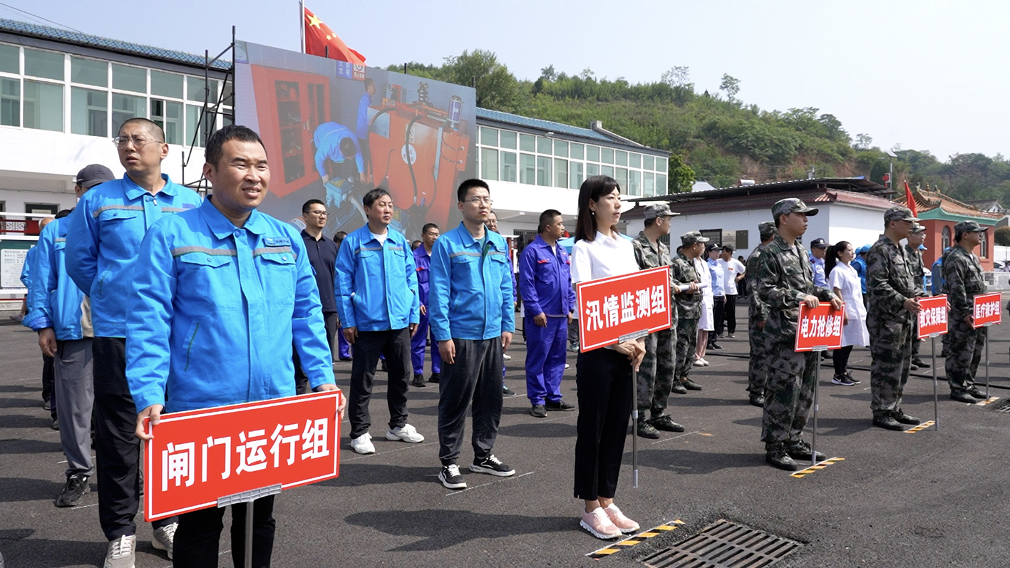 演練模擬當(dāng)?shù)剡B降暴雨,水庫(kù)水位超汛限水位,且上漲較快,接晉城市水務(wù)局泄洪調(diào)度指令,水庫(kù)立即啟動(dòng)防汛二級(jí)響應(yīng),密切監(jiān)視水、雨、工情,完成備用電源、閘門(mén)啟閉啟動(dòng)準(zhǔn)備,及時(shí)發(fā)布泄洪預(yù)警信息。地方政府接到險(xiǎn)情通報(bào)后,迅速啟動(dòng)鄭莊鎮(zhèn)防汛救災(zāi)應(yīng)急預(yù)案,由綜合協(xié)調(diào)組、撤離轉(zhuǎn)移組、治安保衛(wèi)組、險(xiǎn)情巡查組、救災(zāi)保障組、醫(yī)療救護(hù)組、電力搶修組七個(gè)工作組趕往災(zāi)害現(xiàn)場(chǎng),投入搶險(xiǎn)工作。